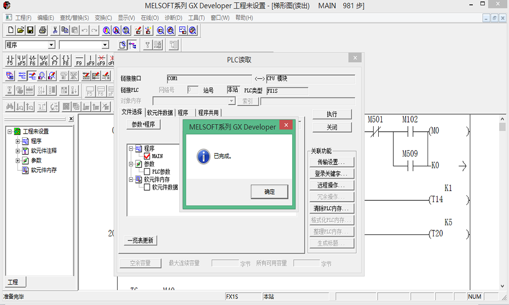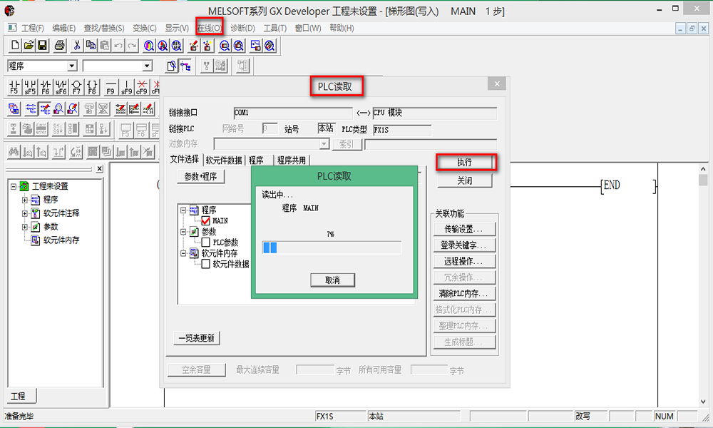 十二、退出此界面,點(diǎn)擊“在線-PLC讀取”,點(diǎn)擊“執(zhí)行”,會(huì)顯示下載進(jìn)度