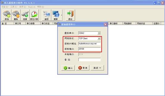 1. 打開我們的虛擬串口軟件,首先點(diǎn)擊“添加”在彈出的對(duì)話框中添加一個(gè)虛擬串口,此時(shí)您需要設(shè)置以下參數(shù)網(wǎng)絡(luò)協(xié)議寫 TCP-client,目標(biāo)IP/域名寫您申請(qǐng)到的域名或者公網(wǎng)IP,譬如我們的域名為huibinlifromusr.xicp.net,,端口號(hào)為路由器外網(wǎng)的端口20108.如下圖設(shè)置: