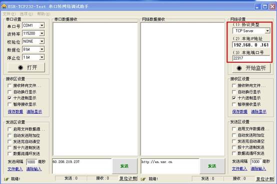 2.在您接收數(shù)據(jù)的電腦上打開我們的測(cè)試軟件“USR-TCP232-TEST”。工作模式作為TCP-SERVER,IP寫本地IP地址,端口號(hào)為路由器映射到局域網(wǎng)內(nèi)的端口號(hào)。
