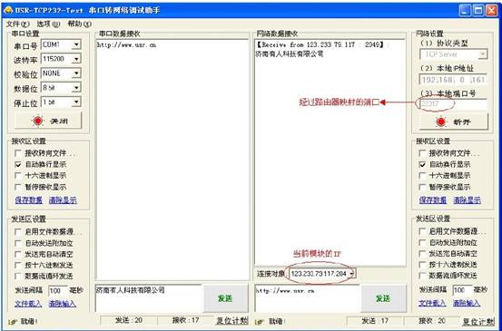 如果連接對(duì)象中出現(xiàn)了建立虛擬串口計(jì)算機(jī)的公網(wǎng)IP地址就證明建立好了TCP連接,也就是您建立的端口映射是成功的。如果沒有成功的話,請(qǐng)檢測(cè)您的硬件連接等。注意測(cè)試的計(jì)算機(jī)上如果有雙網(wǎng)卡的話禁用掉沒有連接到路由器上的網(wǎng)卡,如果開著防火墻的話關(guān)掉windows防火墻。