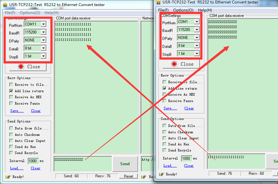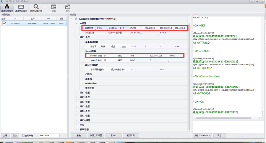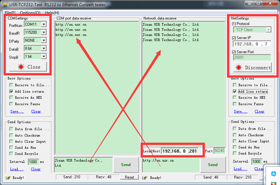 將軟件串口設(shè)置中的串口號配置為COM11。由于設(shè)備默認(rèn)協(xié)議類型為TCP server,所以電腦端連接設(shè)備需要設(shè)置為TCP client連接設(shè)備的server。服務(wù)器IP設(shè)置為設(shè)備IP:192.168.0.7,端口號20001(第一個串口)。