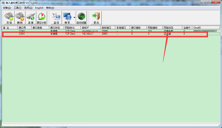 七、打開虛擬串口軟件,點(diǎn)擊“添加”在彈出的窗口中設(shè)置虛擬串口信息,由于上述N668設(shè)備采用TCP server協(xié)議,所以此處網(wǎng)絡(luò)協(xié)議設(shè)置為TCP client。目標(biāo)IP和目標(biāo)端口設(shè)置為N6680的IP和端口。然后點(diǎn)擊“確定”,建立虛擬串口COM1。