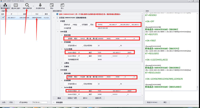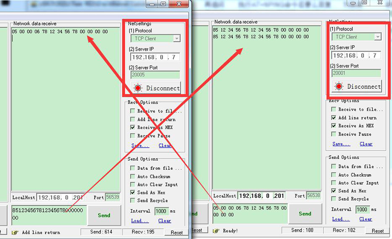 Can1為192.168.0.7-20001;can2位192.168.0.7-20005兩個網(wǎng)絡(luò)助手之間的通信如下(數(shù)據(jù)格式為13字節(jié),按16進(jìn)制發(fā)送)