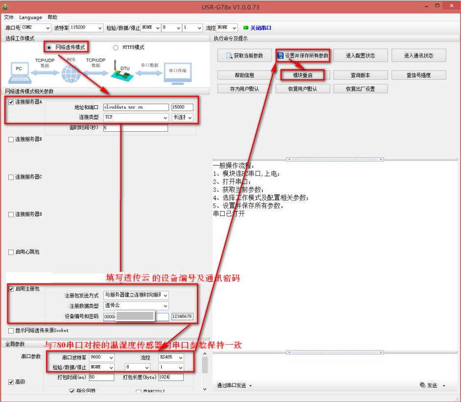 3、設(shè)置完參數(shù)后,將780串口與溫濕度傳感器對(duì)接上,連接服務(wù)器。