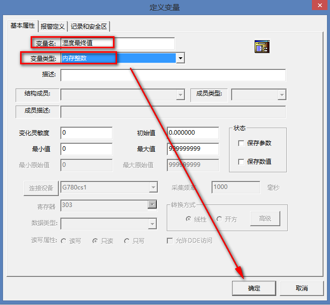 (3)新建變量名:濕度最終值,選擇變量類(lèi)型“內(nèi)存整數(shù)”,點(diǎn)擊“確定”。