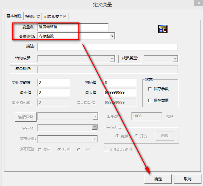 (4)新建變量名:溫度最終值,選擇變量類(lèi)型“內(nèi)存整數(shù)”,點(diǎn)擊“確定”。