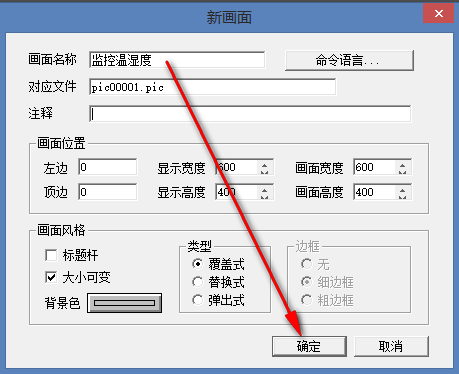 4.8點(diǎn)擊“畫(huà)面”,新建一個(gè)畫(huà)面,畫(huà)面名為監(jiān)控溫濕度,點(diǎn)擊“確定”,進(jìn)入畫(huà)面編輯欄。