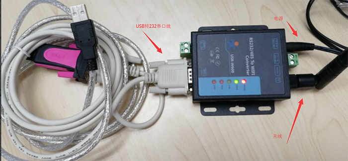 USR-W600(以下簡稱W600)接上供電電源,此時Power指示燈亮起;將W600的串口通過串口線(或者USB轉(zhuǎn)232)接到電腦上,裝上Wi-Fi天線,模塊正常啟動后,work指示燈常亮。