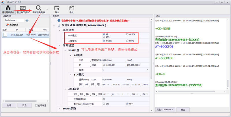 3> 打開設(shè)置軟件,選擇“通過網(wǎng)絡(luò)搜索”-->“刷新設(shè)備列表”,就能夠搜索到W600這個設(shè)備;可以在這個軟件中根據(jù)實際應(yīng)用修改W600的各種參數(shù),這里我們只是做入門測試,就按照出廠默認(rèn)的方式來測試。