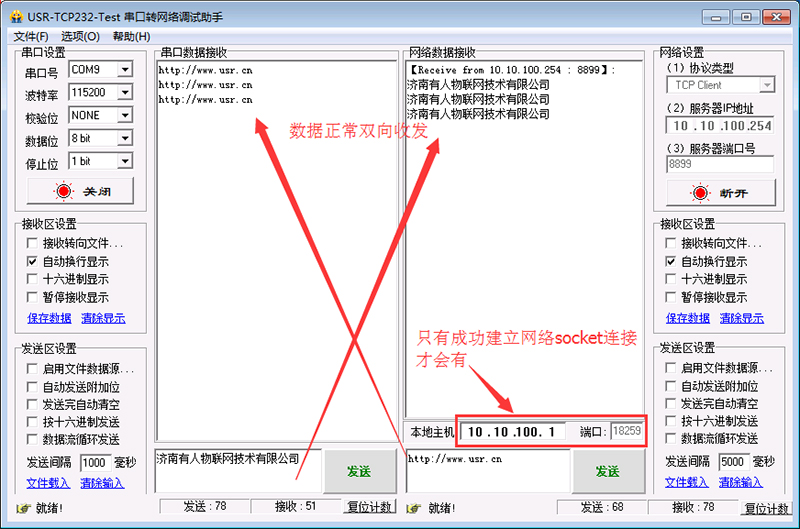 從下圖可以看出,串口和網(wǎng)絡(luò)端可以正常的雙向數(shù)據(jù)收發(fā)