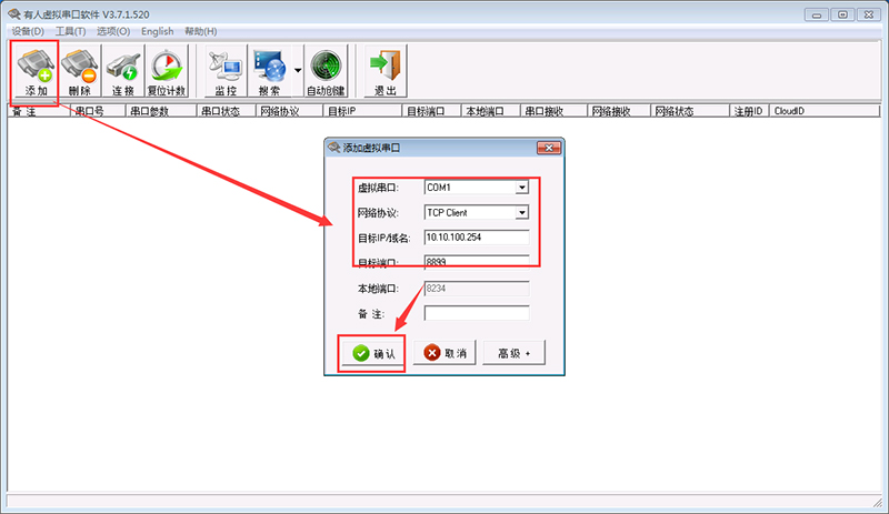 1>添加虛擬串口,網(wǎng)絡(luò)協(xié)議TCP client,服務(wù)器IP地址10.10.100.254,服務(wù)器端口號8899,確認(rèn)