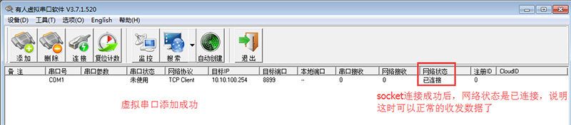 注意:虛擬串口的參數(shù)和上面小黃人的網(wǎng)絡(luò)端設(shè)置是一致的,所以虛擬串口和小黃人的網(wǎng)絡(luò)端不能同時使用,否則會出現(xiàn)沖突,導(dǎo)致數(shù)據(jù)不能正常傳輸。