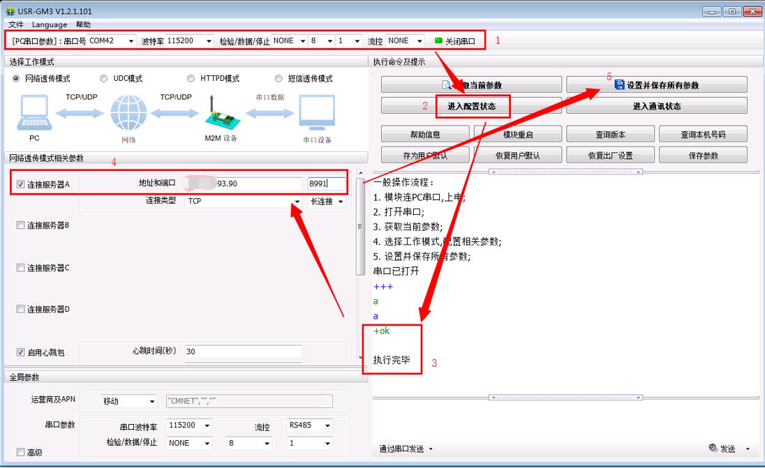 打開串口--->進入配置狀態(tài)--->成功的話,會返回執(zhí)行完畢--->修改服務(wù)器地址和端口--->設(shè)置并保存參數(shù)--->DTU會自動重啟,重啟后會連接服務(wù)器