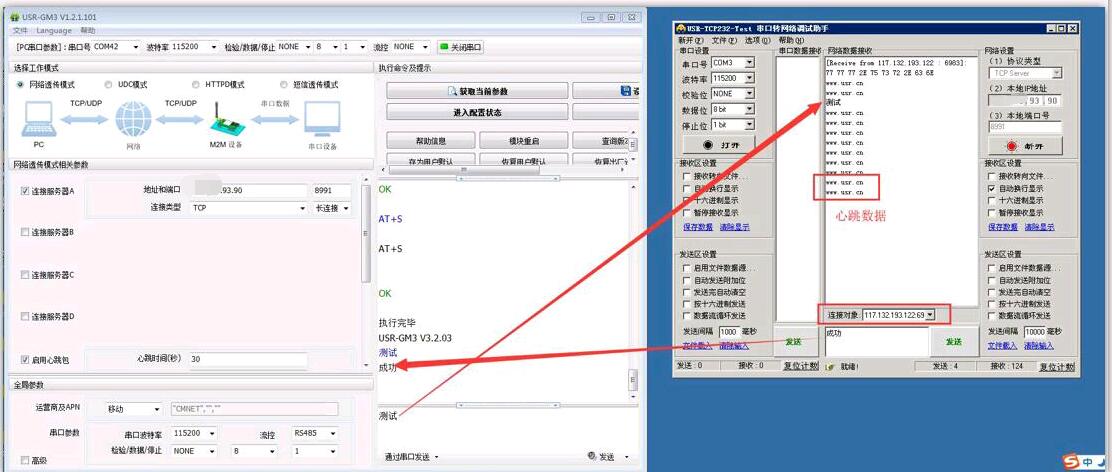 3. 在服務(wù)器端,可以看到已經(jīng)有連接對象了,串口和服務(wù)器端能正常收發(fā)數(shù)據(jù),當(dāng)串口長時間不發(fā)送數(shù)據(jù)的時候,DTU會主動發(fā)送心跳包給服務(wù)器(該功能可以取消,具體參考730的軟件設(shè)計手冊)。