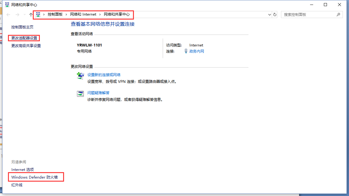 2.按路徑:控制面板》網(wǎng)絡和Internet》網(wǎng)絡和共享中心找到“windows防火墻”和“更改適配器設置”選項,關閉防火墻并禁用與本次測試無關的網(wǎng)卡。并關閉電腦殺毒軟件。