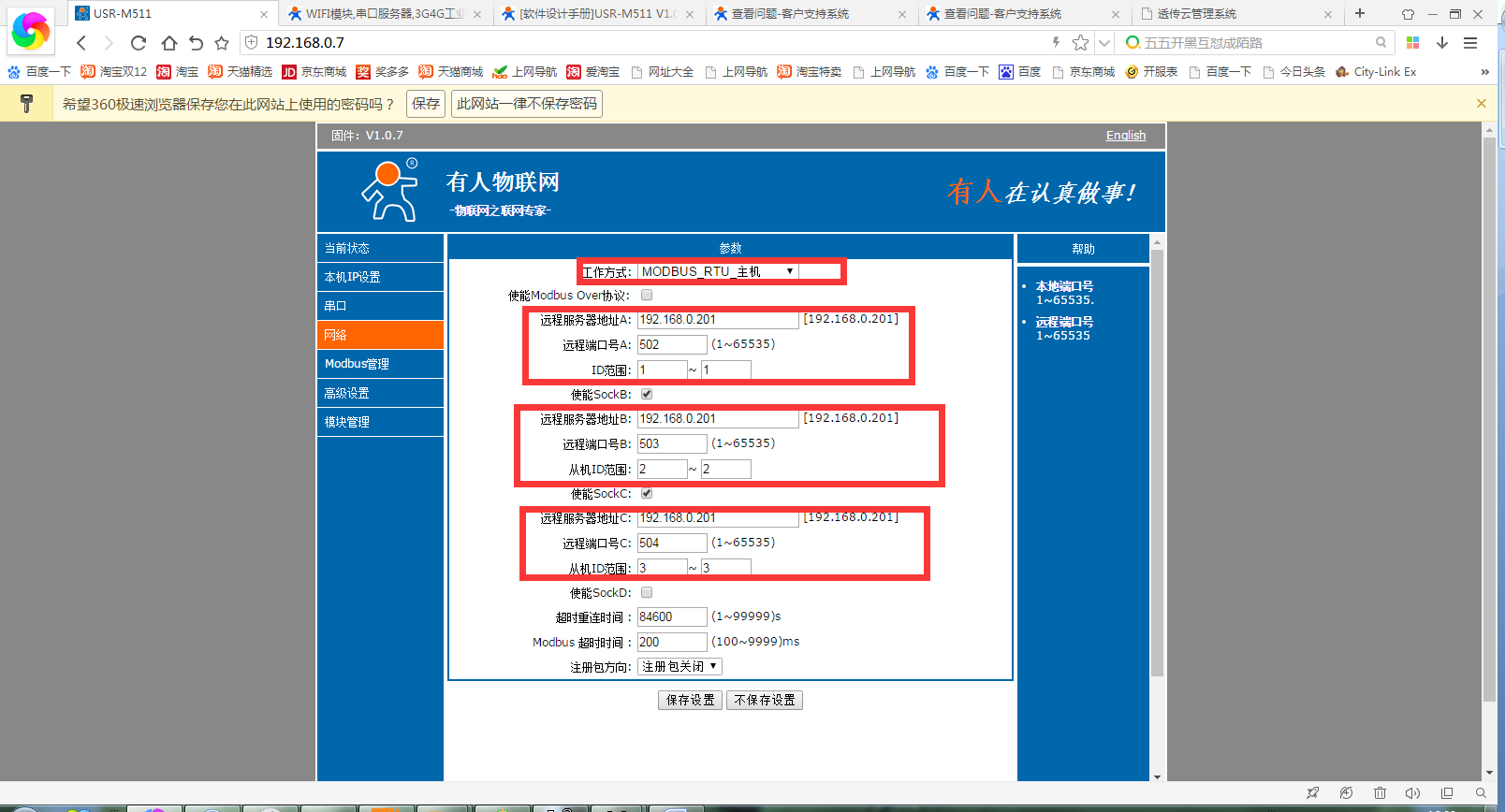 4、設置m511的參數(shù),modbus rtu主機模式,添加3個modbus tcp 從機,ip為電腦ip,端口 502/503/504,id為1/2/3