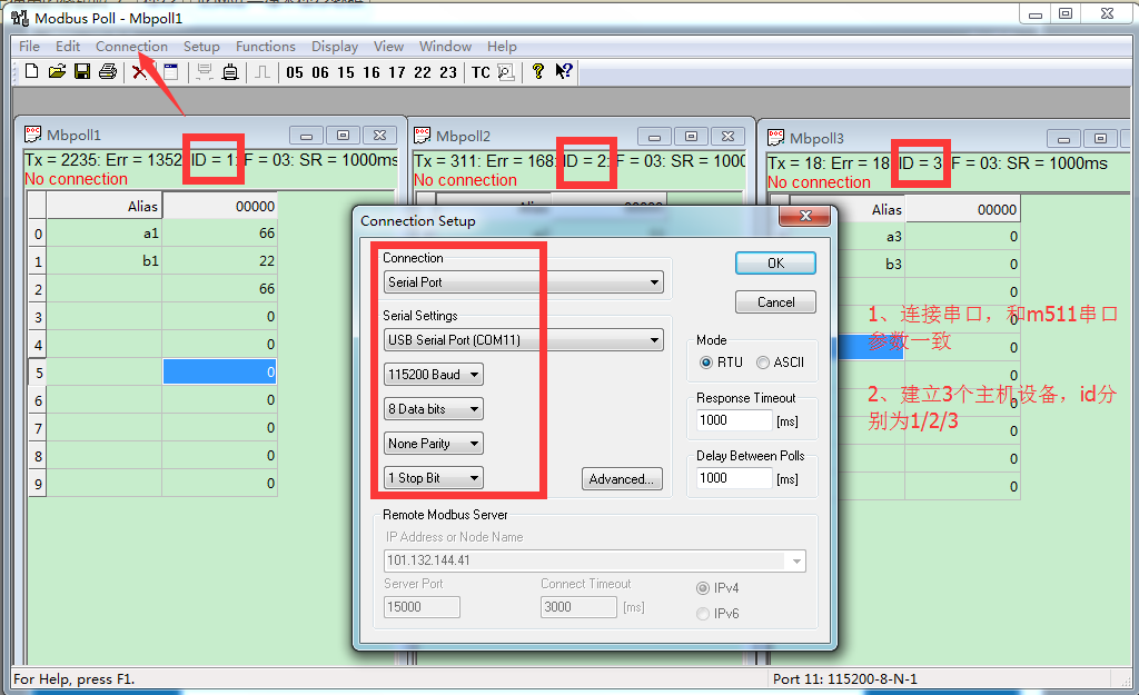 5、打開 Modbus Poll,設置正確的參數(shù),M511 串口接Modbus_RTU_ Poll,所以將Modbus Poll設置為串口,RTU 協(xié)議, id為1/2/3和上面設置對應