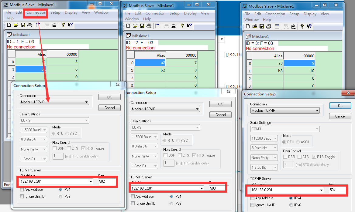 6、 打開“Modbus Slave”,選擇Modbus TCP/IP 模式,設置好目標 IP: 192.168.0.201,目標端口號502、503、504;id為1/2/3和m511設置的對應,(打開軟件三次,分別建立三個modbus tcp從機) 點擊OK,如下圖所示