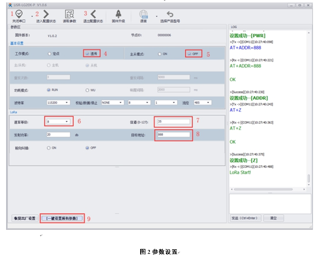 打開LoRa設置軟件(LG207和LG206-P選擇同一個),依次點擊打開串口(選擇A、B對應的串口號,串口參數(shù):115200,None,8,1,NFC)、進入配置狀態(tài)、讀取參數(shù)、配置上表中的參數(shù)、一鍵設置所有參數(shù),關閉LoRa設置軟件。