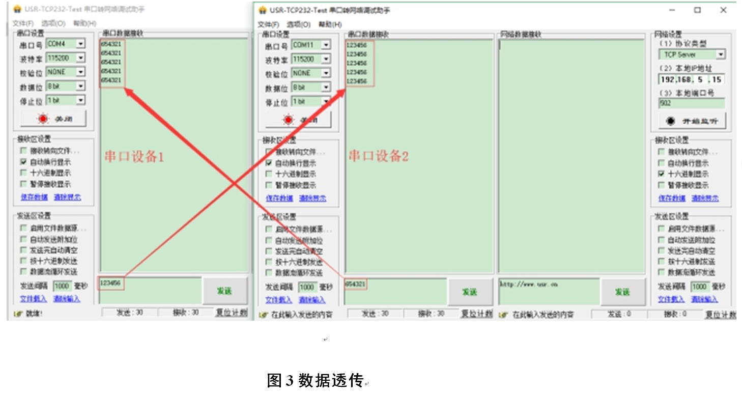 (3)啟動兩個USR-TCP232-Test(模擬串口設備1,2)分別連接LoRa數(shù)傳終端A、B的串口,使用串口設備1發(fā)送數(shù)據(jù)串口設備2可接收數(shù)據(jù)(反之亦然),通信效果如下圖所示: