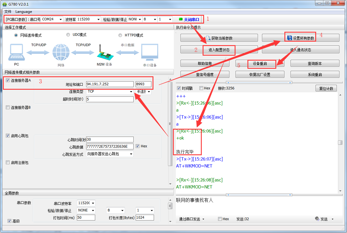 打開串口--->進入配置狀態(tài)--->成功的話,會返回執(zhí)行完畢--->修改服務(wù)器地址和端口--->設(shè)置并保存參數(shù)--->模塊重啟