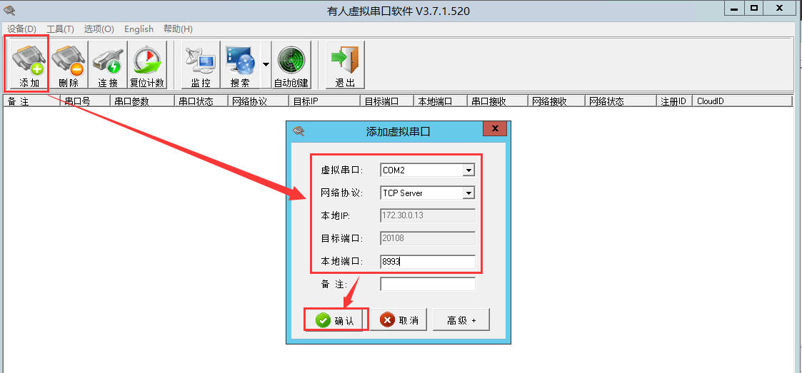 4. 有時客戶的服務(wù)器端安裝的軟件需要通過串口來讀取數(shù)據(jù),這個可以通過我司的虛擬串口實現(xiàn)。安裝虛擬串口后,設(shè)置方法:添加虛擬串口-->選擇COM口-->TCP server(軟件會自動鎖定本地IP)-->設(shè)置本地端口號(和DTU設(shè)置的服務(wù)器端口號一致,本案例中是8993)-->確認
