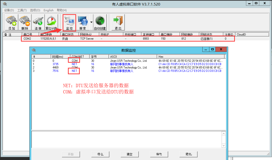 虛擬串口還有一個監(jiān)控的功能,可以監(jiān)控數(shù)據(jù)收發(fā),見下圖