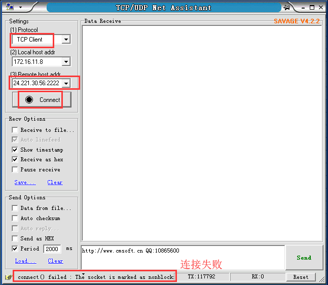 服務(wù)器IP和端口號(hào)是:27.221.30.56:2222,經(jīng)過(guò)百度可以得知這個(gè)IP確實(shí)是公網(wǎng)IP地址,那我們可以用PC端軟件測(cè)試下這個(gè)IP和端口是否可連接的,PC端軟件做TCP client,然后設(shè)置遠(yuǎn)程服務(wù)器地址,點(diǎn)擊“Connect”,可見(jiàn)連接失敗,這說(shuō)明這個(gè)服務(wù)器是有問(wèn)題的,如果PC端軟件連接不上的話,那么DTU也是無(wú)法連接成功的,但是服務(wù)器具體是有什么問(wèn)題,需要跟服務(wù)器端的工程師來(lái)確認(rèn),我們作為DTU的供應(yīng)商,沒(méi)法判斷服務(wù)器端的問(wèn)題的。