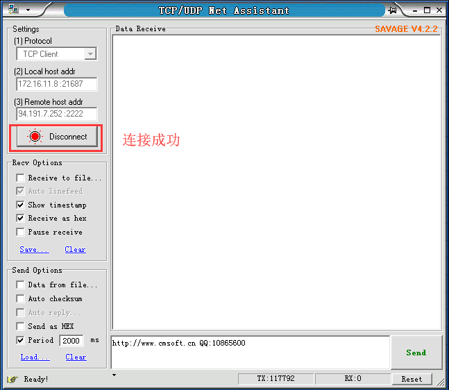 服務(wù)器IP和端口是:94.191.7.252:2222,我們?cè)儆密浖y(cè)試,可以連接成功。那么用DTU也是可以連接這個(gè)地址和端口的。