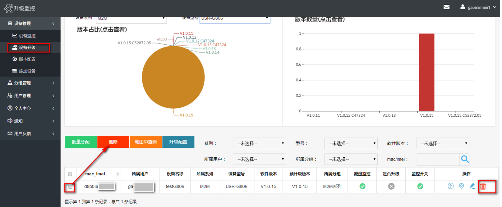 點(diǎn)擊“設(shè)備升級(jí)”,對(duì)于要?jiǎng)h除的設(shè)備,勾選前面的選擇框然后點(diǎn)擊“刪除”,或者是直接點(diǎn)擊垃圾桶圖標(biāo)進(jìn)行刪除設(shè)備