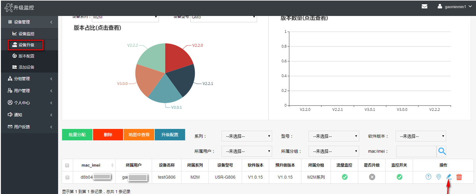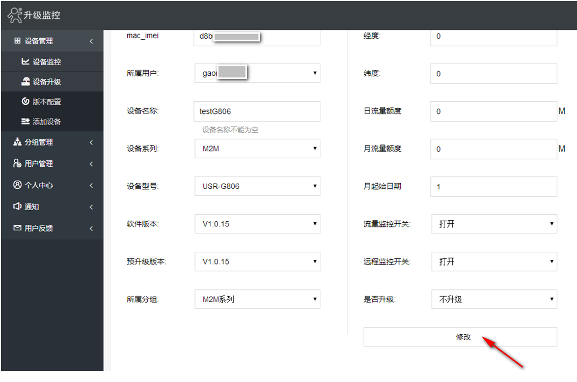 點(diǎn)擊“設(shè)備升級(jí)”,對(duì)于要修改的設(shè)備信息,點(diǎn)擊編輯按鈕,出來(lái)修改信息的界面后,直接更改,更改完后,點(diǎn)擊“修改”即可保存信息。