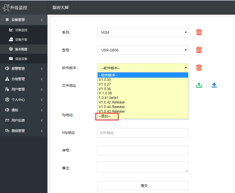 4、點(diǎn)擊“版本配置”,系列選擇M2M,型號(hào)按照實(shí)際情況填寫,軟件版本選擇添加--輸入自己設(shè)備目前的版本號(hào)