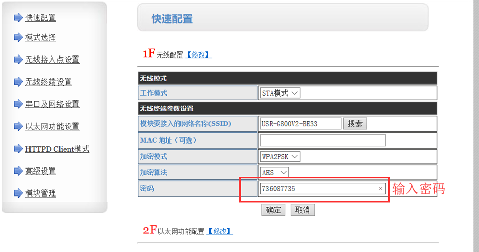 (1)點(diǎn)擊快速配置,選擇STA工作模式,點(diǎn)擊搜索,搜索路由器,選擇要連接的路由器