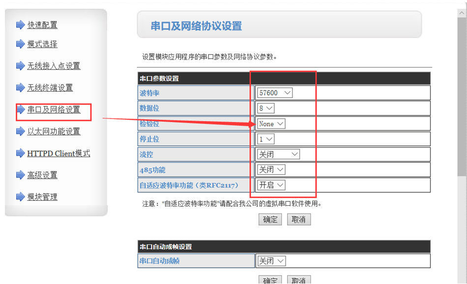 3、點(diǎn)擊串口及網(wǎng)絡(luò)設(shè)置,相應(yīng)設(shè)置如下:(波特率可根據(jù)自己需要設(shè)置) 點(diǎn)擊確定
