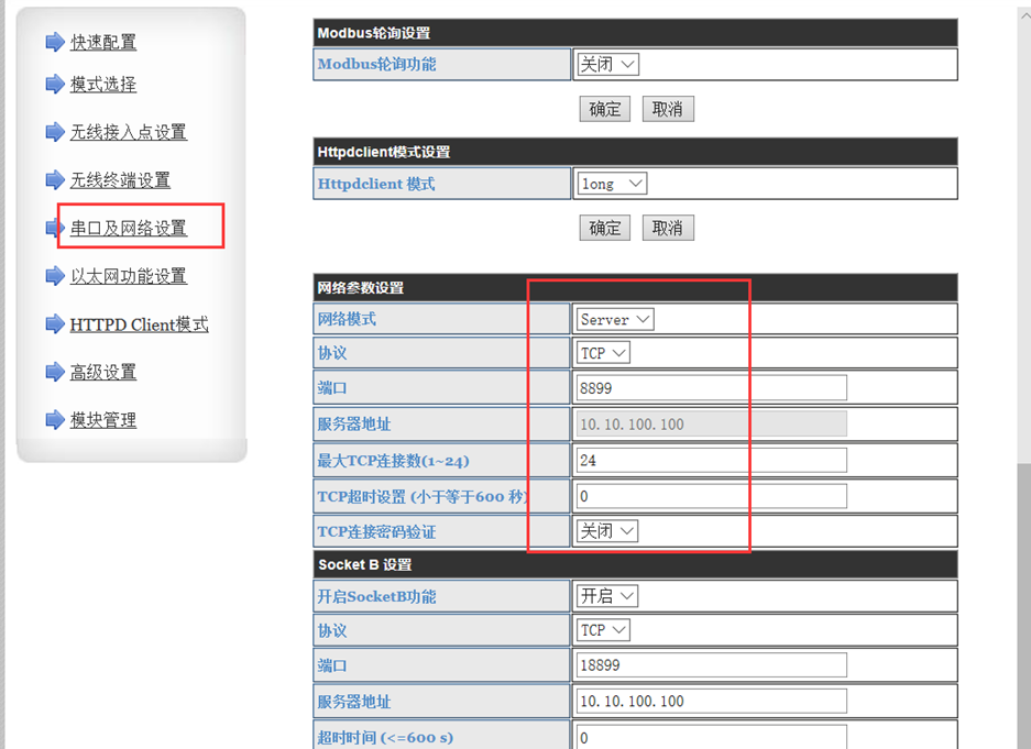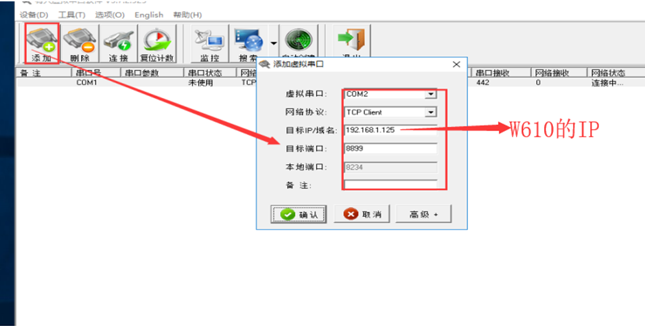 4.設(shè)置W610為TCP Server 協(xié)議,端口號默認(rèn)8899(可根據(jù)自己需求設(shè)置) 點(diǎn)擊確定