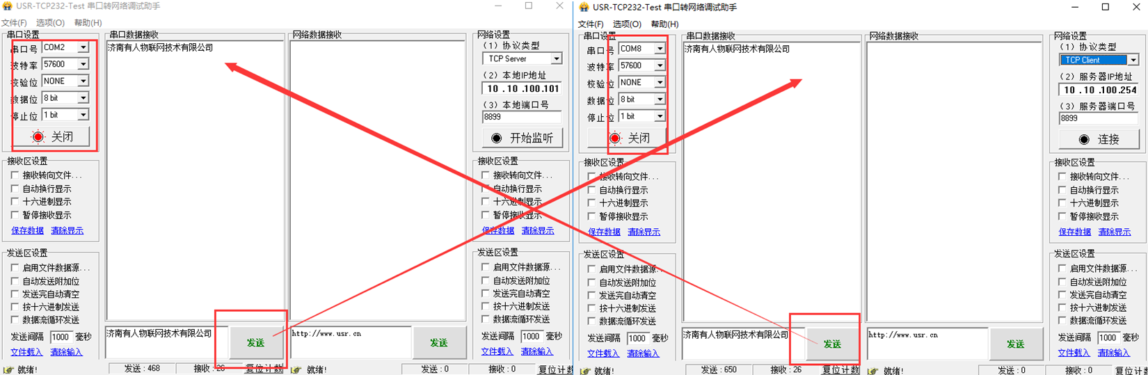 打開兩個串口調(diào)試助手測試,結(jié)果如圖: