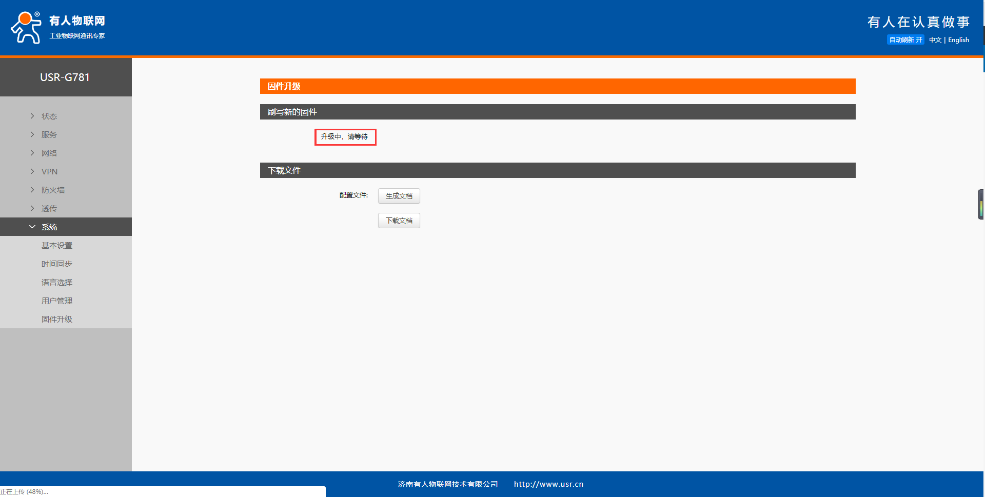 4、 進(jìn)入系統(tǒng)----固件升級(jí)界面,選擇對(duì)應(yīng)的固件文件(請(qǐng)登錄http://h.usr.cn/提交工單并備注當(dāng)前固件版本和郵箱地址,技術(shù)支持會(huì)將固件文件發(fā)送至您的郵箱),點(diǎn)擊升級(jí),會(huì)提示正在升級(jí)。此時(shí)不要重啟設(shè)備,不要斷電,耐心等待約一分鐘左右。設(shè)備升級(jí)固件完成后會(huì)自動(dòng)重啟(可觀察指示燈)。