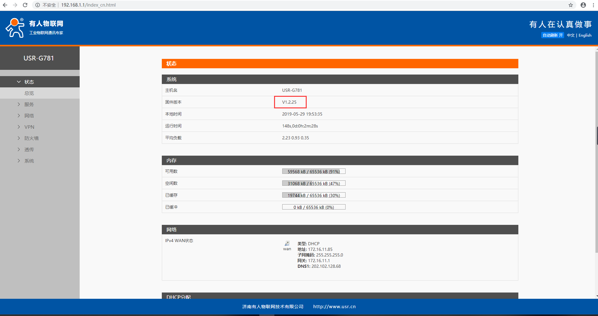5、 等待設(shè)備升級(jí)固件完畢自動(dòng)重啟完成后,重新進(jìn)入配置網(wǎng)頁,可在狀態(tài)總覽頁面查看到固件版本已經(jīng)更改