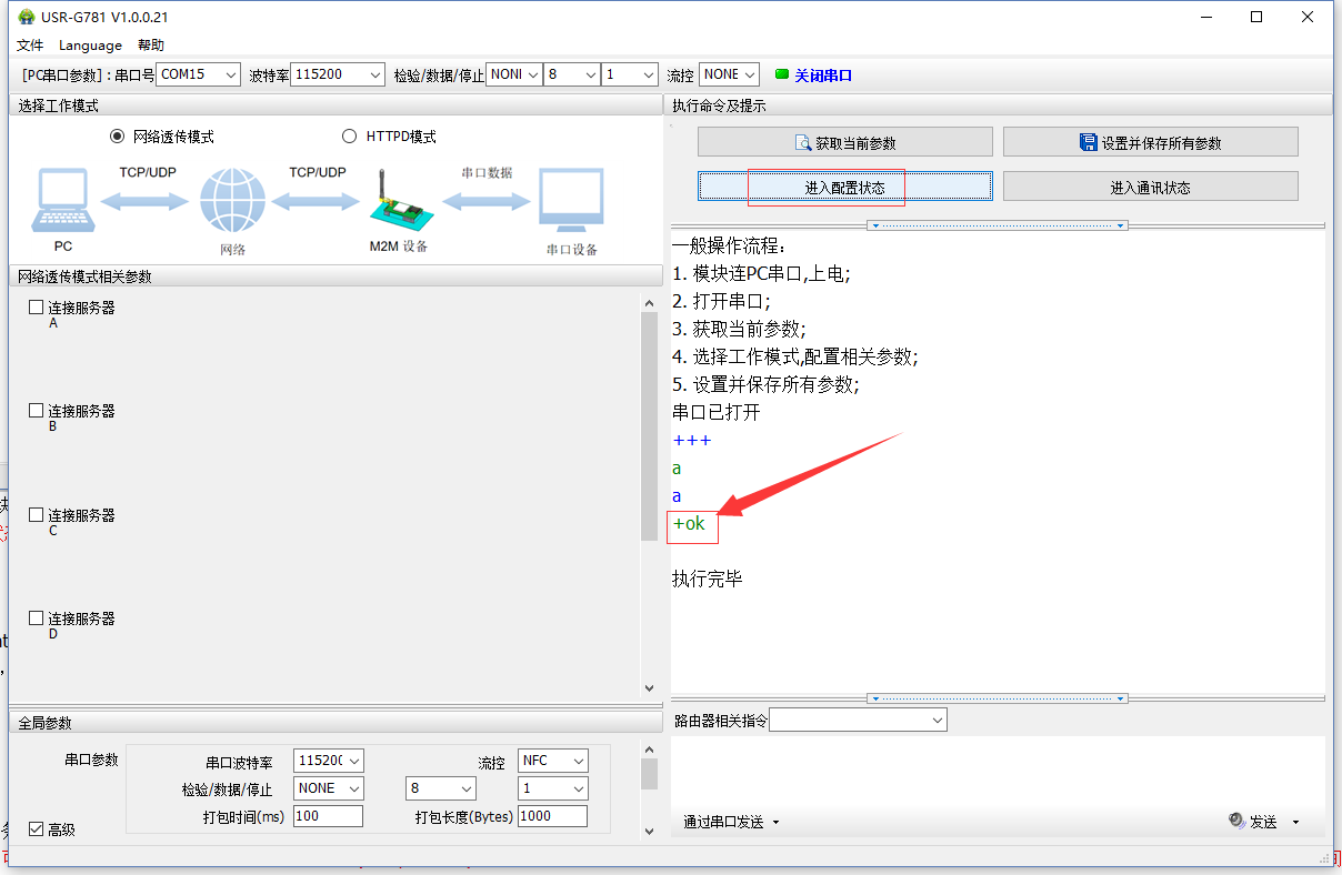 (4)打開串口后,先點擊進入配置狀態(tài),如果模塊能返回+ok的字符,說明電腦和模塊連接是沒有問題的;然后點擊進入通訊狀態(tài),做數(shù)據(jù)通訊測試。如果不返回+OK的話,請參考(步驟4)