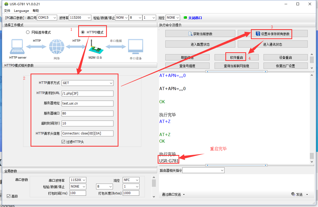 (1) 硬件連接:裝上sim卡,接上天線,G781的串口通過USB轉(zhuǎn)RS232/485接到PC上,用我司提供的12V電源適配器供電。