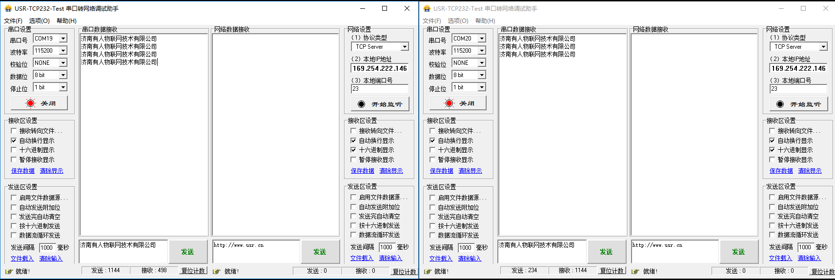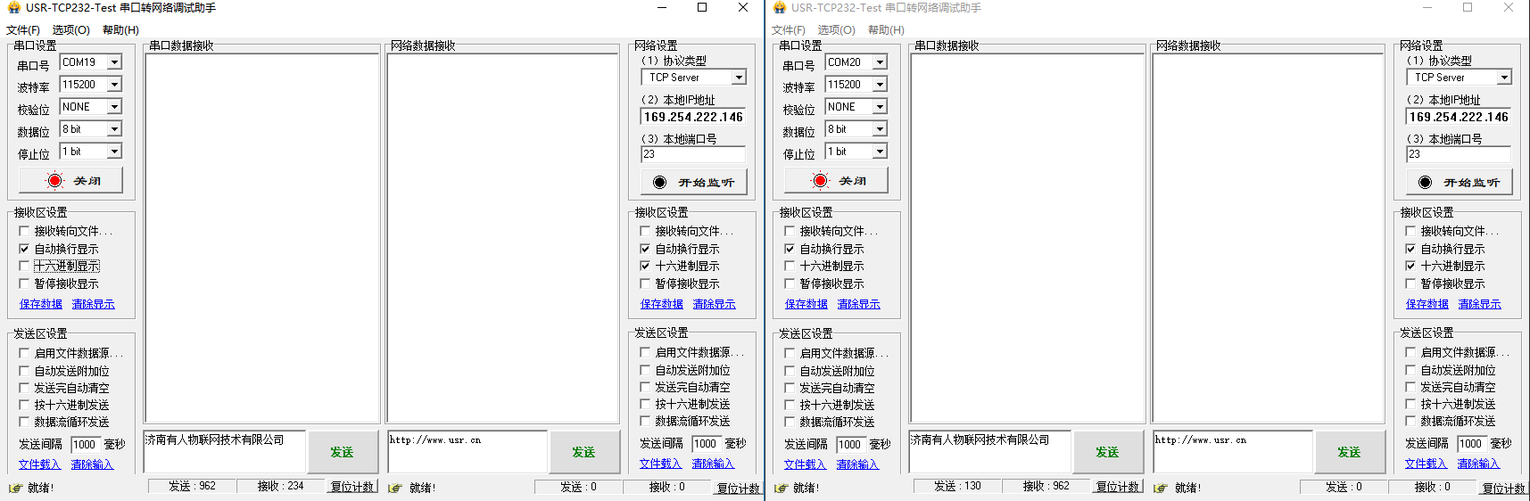 3. 將兩太設備通過網線鏈接,分別用USB轉232串口線將他們鏈接到電腦上,打開兩個測試軟件(USR-TCP232-Test-V1.3),分別打開兩者對應的串口: