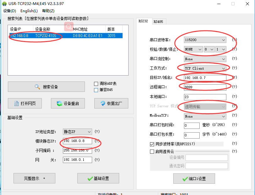 2. 設(shè)置410S (第二臺(tái))的參數(shù):打開設(shè)置軟件USR-TCP232-M4-setup-V2.3.3.97,設(shè)置他的工作方式為TCP clinet,設(shè)置他的“目標(biāo)IP/域名”為:192.168.0.7,設(shè)置遠(yuǎn)程端口號(hào)為8899,然后點(diǎn)擊“端口1設(shè)置”,點(diǎn)擊“基礎(chǔ)設(shè)置”再點(diǎn)擊“設(shè)備重啟”。如圖所示: