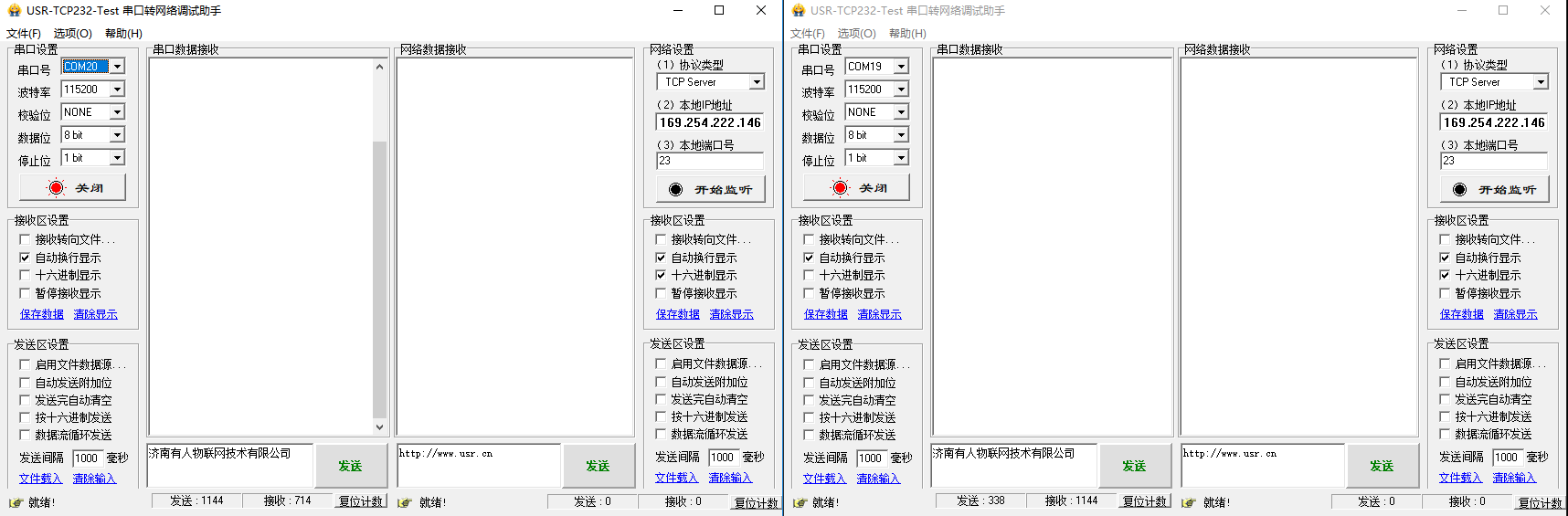 3. 將兩太設(shè)備通過(guò)網(wǎng)線鏈接,分別用USB轉(zhuǎn)232串口線將他們鏈接到電腦上,打開兩個(gè)測(cè)試軟件(USR-TCP232-Test-V1.3),分別打開兩者對(duì)應(yīng)的串口: