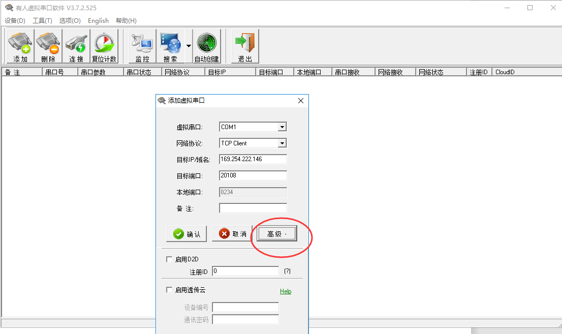 1. 手動(dòng)添加虛擬串口按鍵,他可以根據(jù)模塊的配置信息手動(dòng)添加虛擬串口,如果是需要將虛擬串口軟件鏈接到透?jìng)髟?,要通過這個(gè)高級(jí)設(shè)置啟用透?jìng)髟?,然后將設(shè)備和透?jìng)髟平㈡溄印?/span>