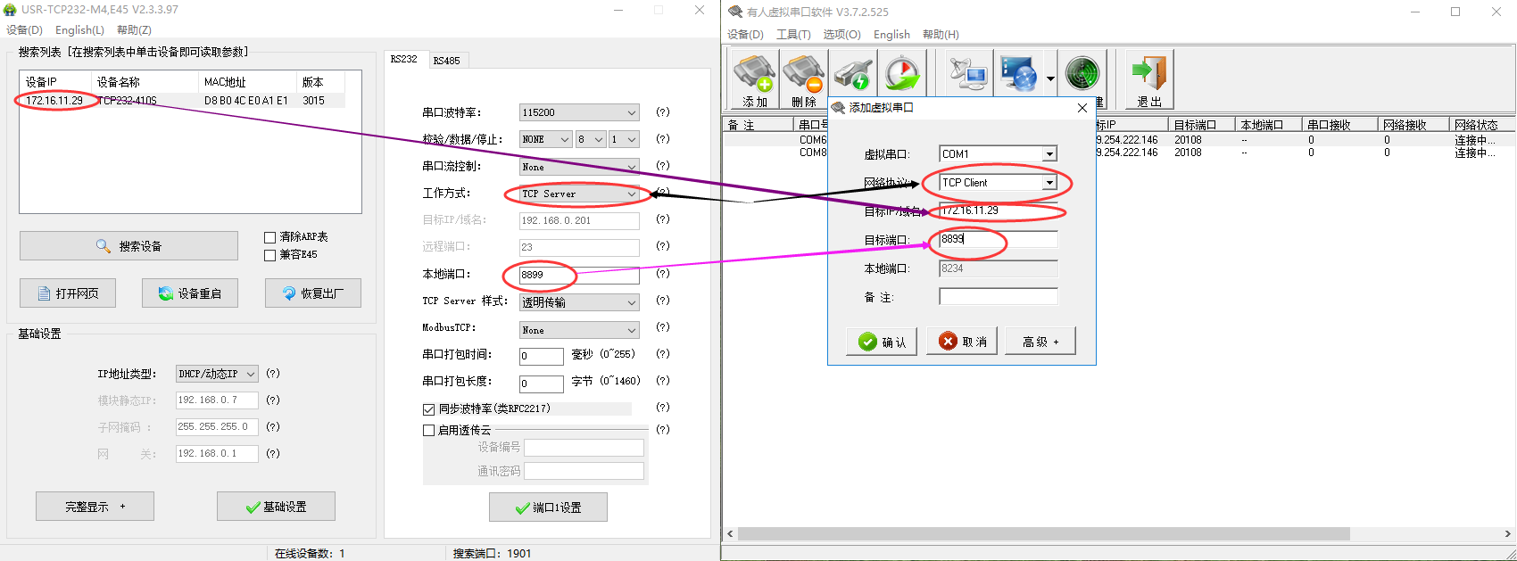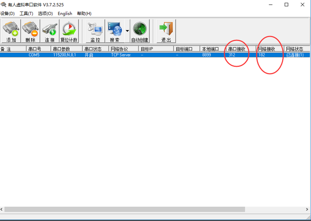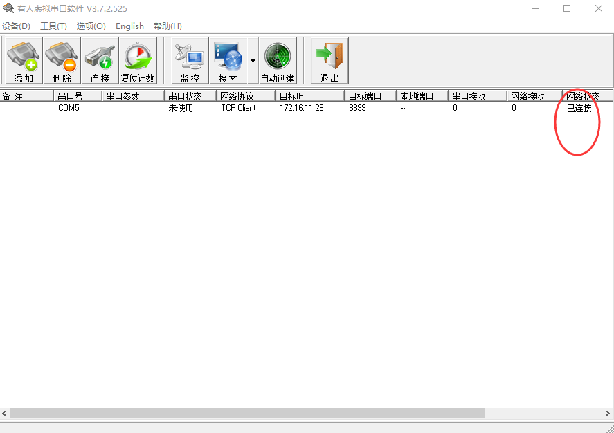 當(dāng)設(shè)備做客戶端的時(shí)候(client),他需要主動(dòng)鏈接服務(wù)端(sever),這個(gè)時(shí)候如果已經(jīng)鏈接到服務(wù)端(sever),虛擬串口軟件會(huì)顯示已連接(1).