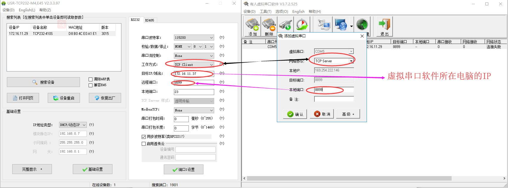 1. 設(shè)備作sever,虛擬串口作client: