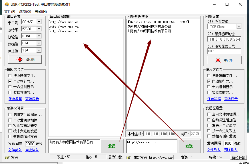 從下圖可以看出,串口和網(wǎng)絡(luò)端可以正常的雙向數(shù)據(jù)收發(fā)