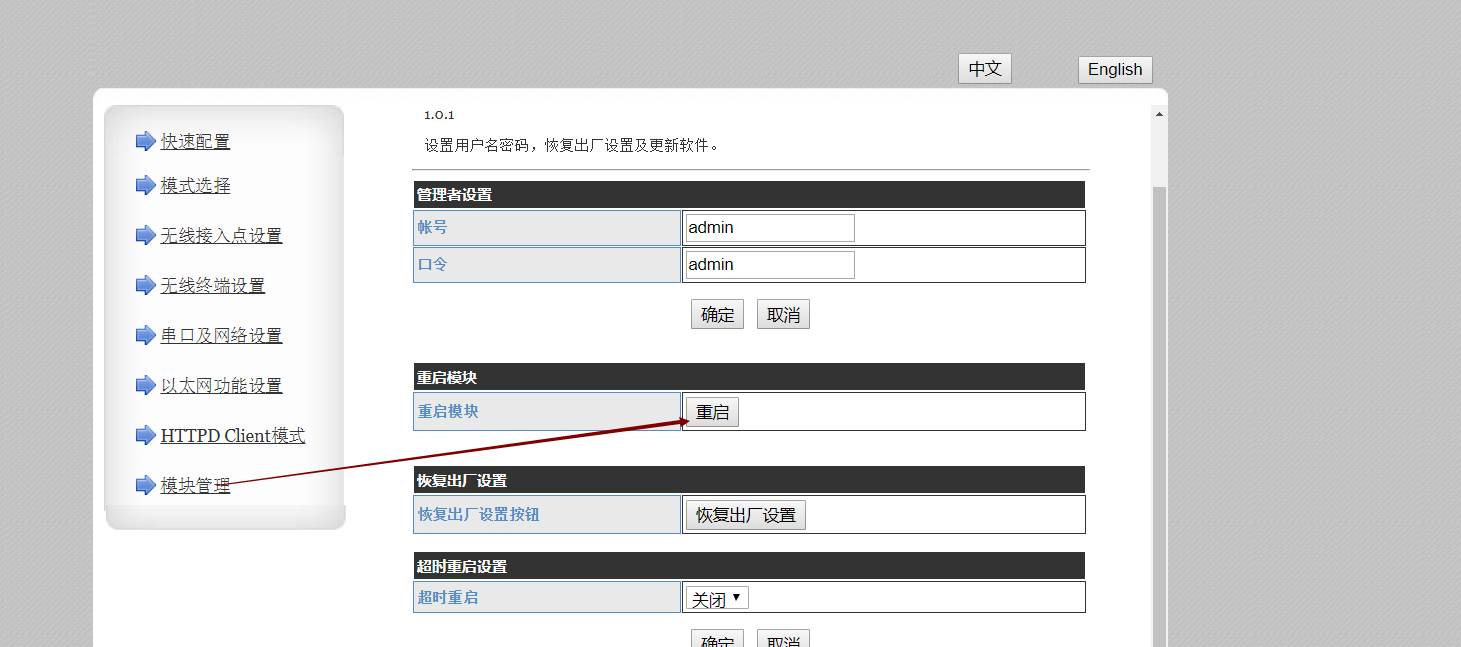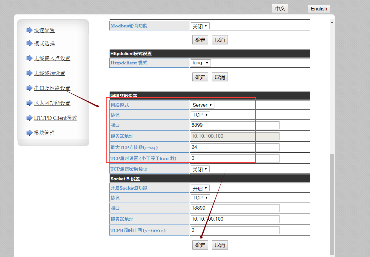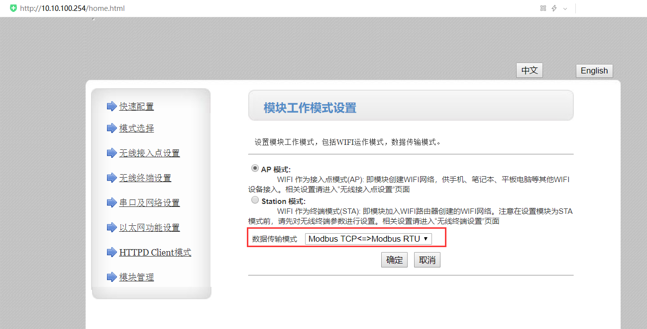 4、模式選擇: STA,modbus rtu<=>modbus tcp協(xié)議轉(zhuǎn)換。 注:確定后,不用立刻重啟,等著全部修改完成一塊重啟。