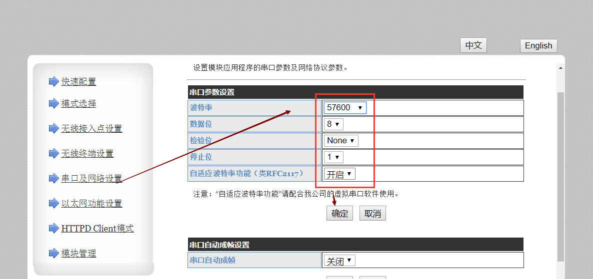 在這個選項中,可以設(shè)置w630的串口參數(shù)以及網(wǎng)絡(luò)參數(shù),客戶可以根據(jù)實際情況確認(rèn)是否需要修改波特率以及w630的網(wǎng)絡(luò)工作模式,在本案例中不做修改,采用默認(rèn)狀態(tài)。