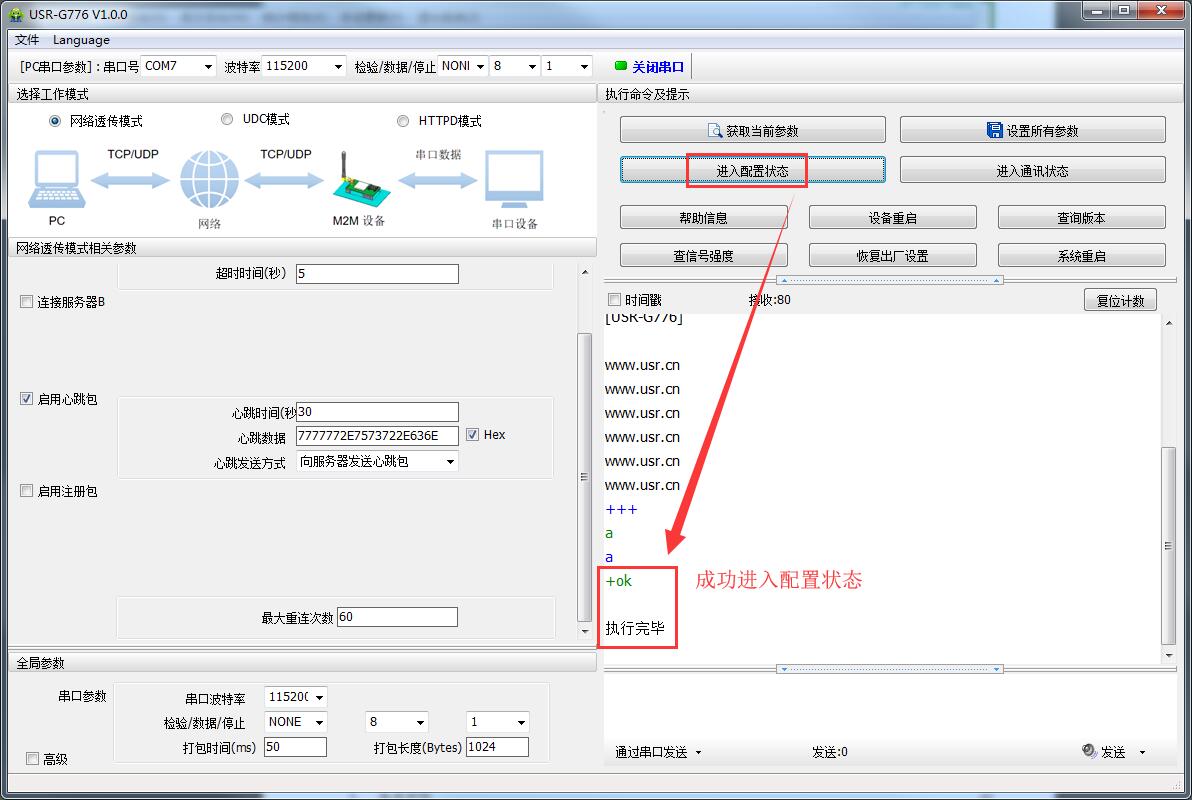 A:1>進(jìn)入配置狀態(tài)后:模塊只能識別AT指令(注意AT指令最后一定要加回車換行),不能進(jìn)行數(shù)據(jù)收發(fā)的;如果發(fā)送數(shù)據(jù)的話,模塊就會報錯或者數(shù)據(jù)無法發(fā)送成功,這時候需要先進(jìn)入通訊狀態(tài)(成功現(xiàn)象見上面第5步的圖片),然后在發(fā)送數(shù)據(jù)(總有客戶在配置狀態(tài)下,發(fā)送數(shù)據(jù)導(dǎo)致發(fā)送數(shù)據(jù)失敗或者模塊報錯)